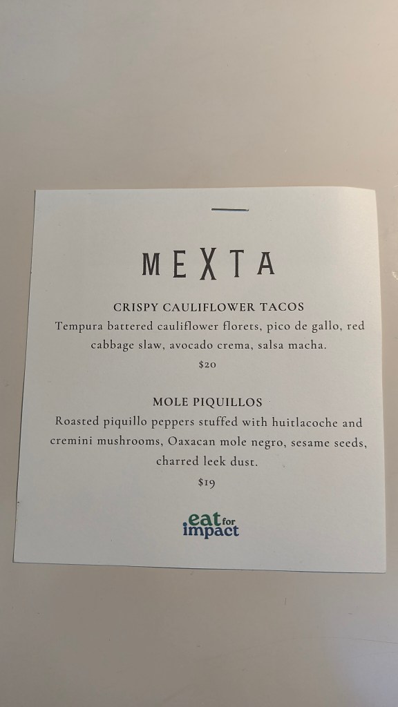 As part of the Eat for Impact initiative, I had the chance to enjoy a plant-based dinner at Mexta, and from the moment I walked in, it felt like something special. The ambiance is warm, earthy, and elegant — from the natural textures to the golden lighting and custom design work, every inch of the space was curated with care. This is the kind of place that’s made for date nights, special occasions, or just treating yourself to something memorable.
