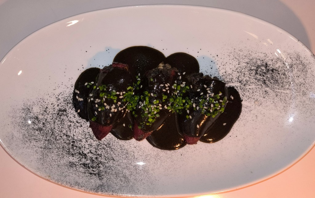 - Mole Piquillos – Roasted piquillo peppers stuffed with huitlacoche and cremini mushrooms, topped with Oaxacan mole negro, sesame seeds, and charred leek dust.