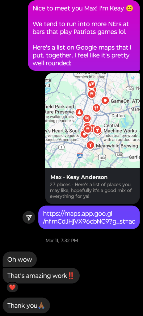 Max reached out as a New England transplant new to Austin. I put together a custom map of bars, hangouts, and chill activities — and he loved it.