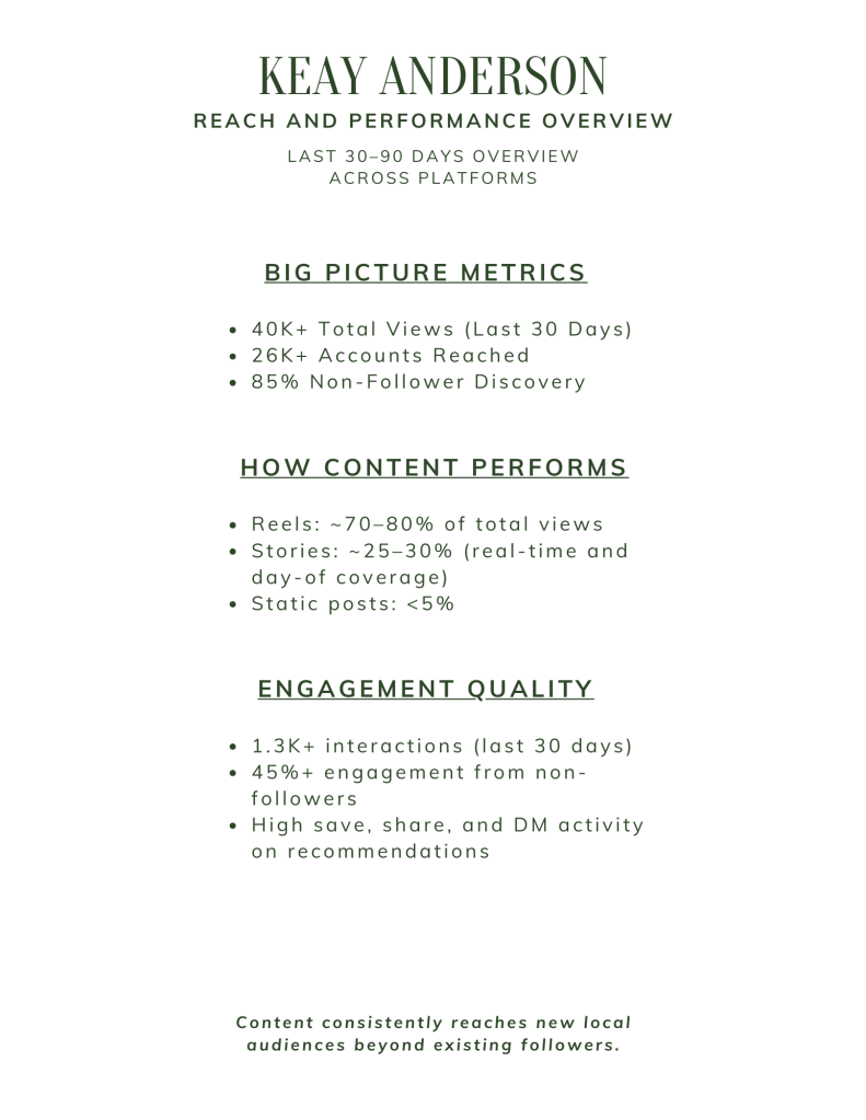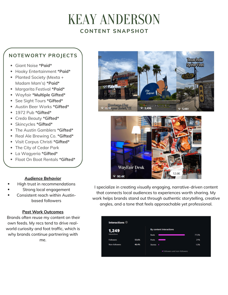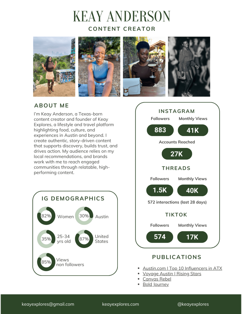 Keay Explores is a platform rooted in real experiences, from savoring local flavors in Austin to spotlighting vibrant events and destinations. With a growing community and over 61k+ monthly views average across all platforms, my content consistently engages, inspires, and drives action.